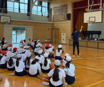 5年生は、横浜を本拠地に構えるプロバスケットチーム「横浜ビー・コルセアーズ」のコーチを招き、「バスケットボール出張授業」を受けました。