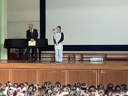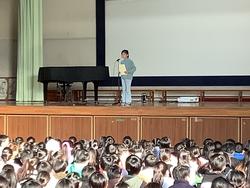 校内の感染症の流行が落ち着いているので、今日は久々に全校が体育館に集って特別朝会を行いました。図書委員会が計画したしおりコンテストの表彰をしたり、児童指導担当から冬休みの安全な過ごし方について話をしたりしました。