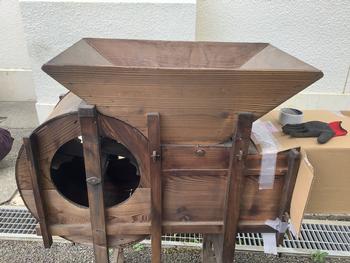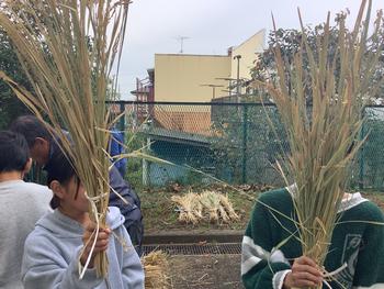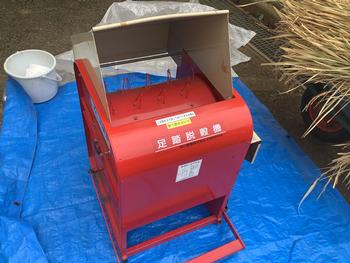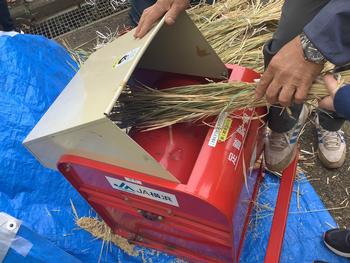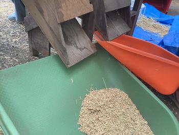 足踏み脱穀機を使い、稲から籾がこそぎ落とされていく様子に驚く子どもたち。