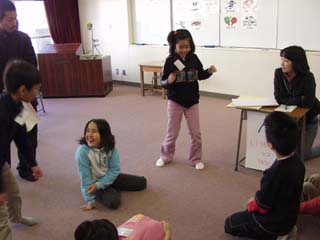 | 3.4組と3年生の英語活動の紹介です。。3・4組では、ハリーポッターの世界よろしく英語を使った「魔法の呪文」です。いろいろな動物に変身してその鳴き声をまねしました。 3年生は、「ジェスチャーゲーム」です。ジェスチャーを見て何のスポーツかを英語で当て、それができるかどうかを英語で質問しました。さあ。Yesだったかな?Noだったかな? |