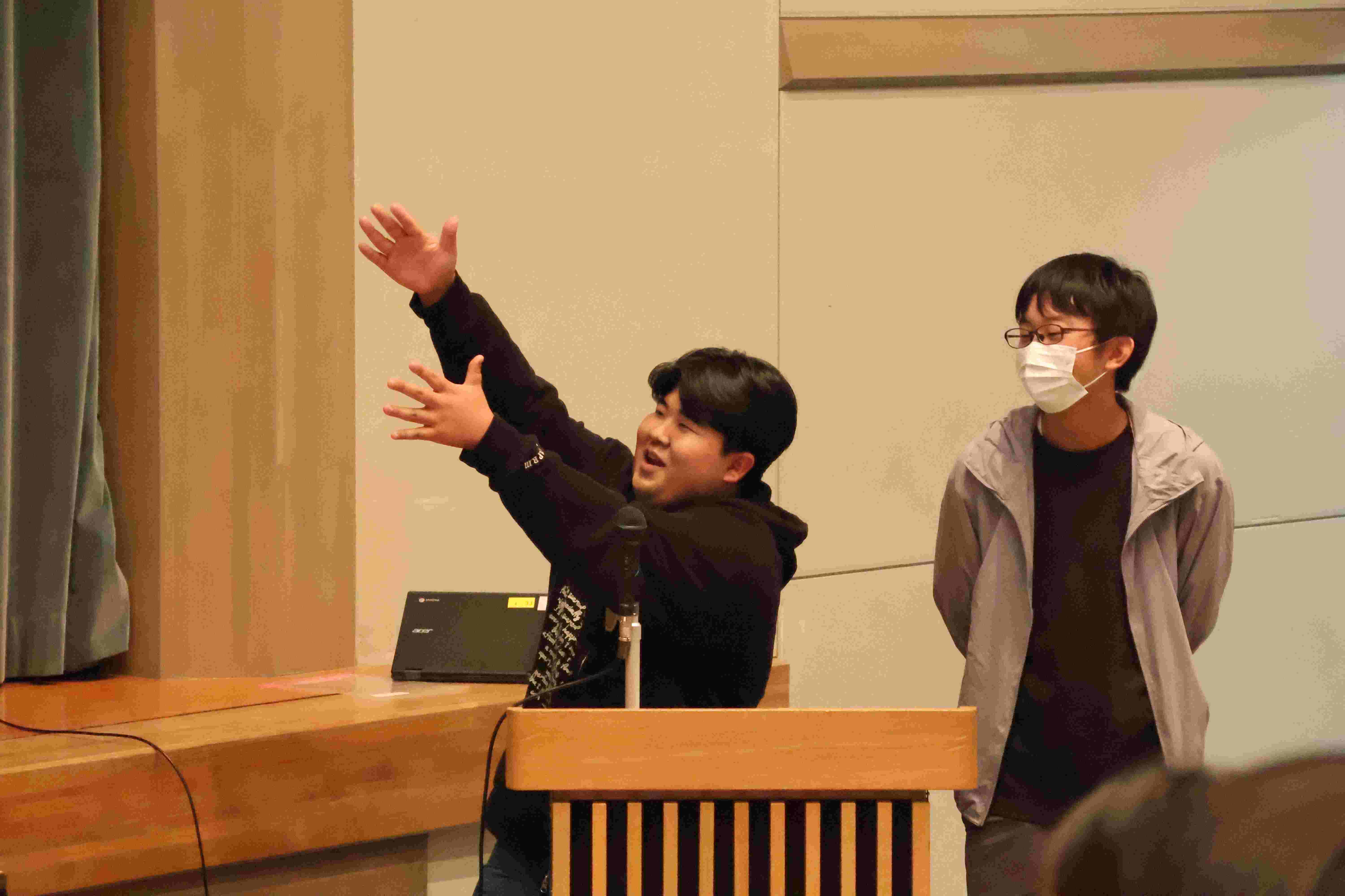対話集会のあとに生徒会から「横浜子ども会議」の報告がありました。生徒会役員一人ひとりが、横浜子ども会議での他校の発表や話し合いの様子など様々なスライドを作り報告しました。(生徒会執行部)