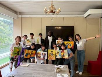 お話を伺い、いくつか質問をした後で、事前にお願いしていたアート作品を受け取りました。ムディボさんの世界観の中で、生徒たちの写真を正確に描いてくださり、みんな大喜びでした。