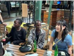 そして場所を移動し、ムディボさんと、ムディボさんのアートスクールに通う3人の子ども達、ボランティアの方も一緒にランチを食べました。初めはお互いに緊張の面持ちでしたが、自己紹介したり、話のきっかけをつくってもらったりしたことで、子ども達に笑顔が見えるようになりました。緊張も解けてきた頃、ちょうどヤギ肉のニャムチョマ(焼肉)が出てきました。私たちに、ウガリ(白とうもろこしやキャッサバの粉を練り上げて作られる主食)の食べ方を教えてくれながら、美味しそうに子ども達が肉を頬張る姿に、こちらも嬉しくなった一方で、「こんなお肉はめったに食べないんだ」という一言に、胸が苦しくなりました。