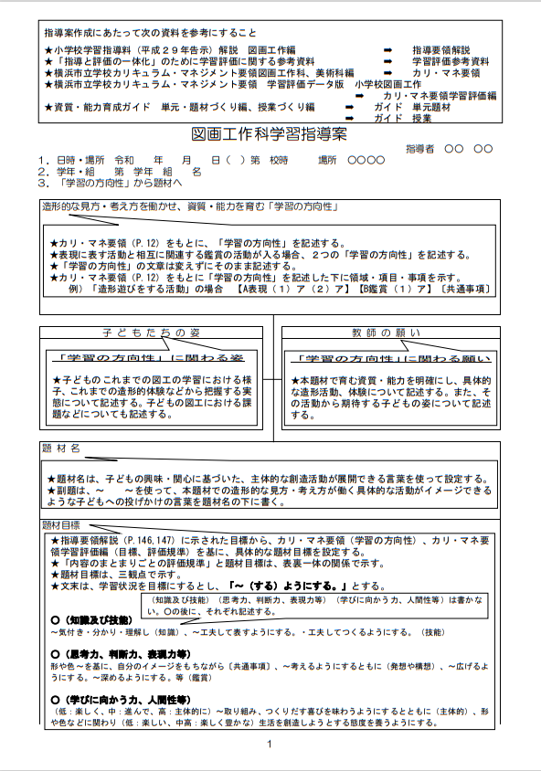 令和5年度 指導案の形式について 図画工作科学習指導案の型です。ダウンロードしてご活用ください。 図画工作科学習指導案(PDF)はこちらから 図画工作科学習指導案(Word)はこちらから (YYNET等からのDLをお勧めします) 令和5年度 略案の指導案形式について 図画工作科学習指導案の略案例です。ダウンロードしてご活用ください。 図画工作科学習指導案の略案例(PDF)はこちらから 図画工作科学習指導案の略案例(Word)はこちらから