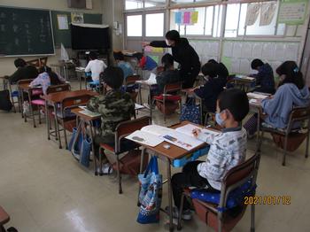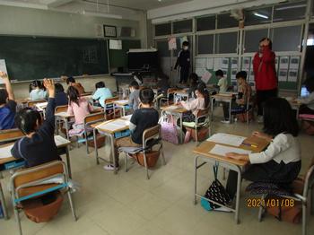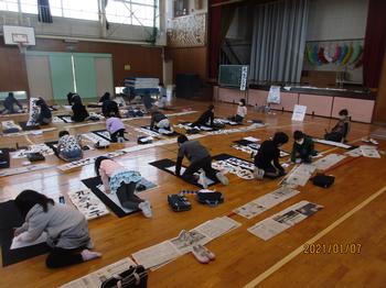 3~6年生は、体育館で毛筆、1、2年生は、教室でフエルトペンで書きます。