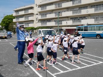 泉警察署員、交通安全協会の方々の指導の下、1年生は校庭で 道路の歩き方、横断歩道の渡り方など、安全に気を付けて歩くことを学びました。