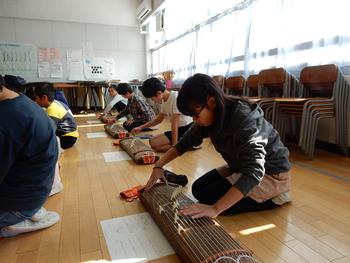 コミュニティハウスで箏教室を開いている平林容子先生に、5,6年生が箏の指導をしていただきました。2人組の曲の演奏を聴き、様々な演奏手法を知りました。子どもたちが「さくら さくら」を1時間で演奏できるようになり、日本固有の音楽や楽器にたっぷり触れられた貴重な時間となりました。