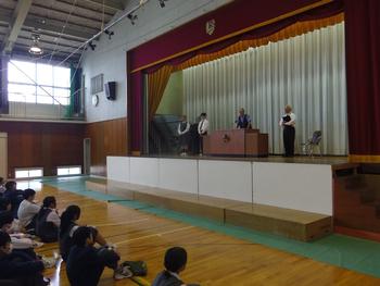 地域の方にもご来校いただき、先日の英語スピーチコンテストの2名の生徒の受賞について、お祝いとニューヨーク派遣に向けての励ましのお言葉をいただきました。