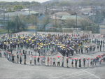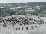 1~9年生が校庭に集まり、デザインに合わせて色画用紙を空に向けて持ちました。