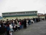 当日の朝、在校生と運動場でお別れ式を行いました。1年生から6年生にコサージュが手渡され、1年生から5年生でビリーブを合唱しました。
