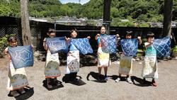 2日目もさわやかな天気です。体調の悪い子もなく快調な滑り出しです。朝食も夕食と一緒のビュッフェ形式で、パンやごはん、シリアルなども選ぶことができました。朝食後は、牧場体験と藍染め体験に分かれて活動しました。服部牧場では、乳しぼり体験をした後、おいしいアイスクリームを食べました。レインボープラザでは、バンダナを割りばしと輪ゴムで模様を作り、藍色の染料の中に入れて染めました。終わった後は、組み紐体験をしました。活動がスムーズに進みましたので予定よりも早い帰校となりました。実行委員会を中心に楽しく協力しあってよい体験学習となりました。