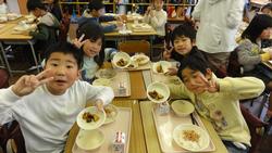 相沢小学校の誕生日をお祝いして、19日の給食は特別メニューで赤飯がでました。メニューは、赤飯、ボイルドキャベツ、鶏肉の竜田揚げ、卵スープ、牛乳です。1年生の教室に行くとお家ではなかなかでない赤飯に最初は戸惑っている子もいましたが、食べ始めると美味しいことに気づき喜んで食べていました。