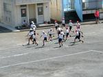 朝の会が終わった後に、体力作りの一環として、また1日の始まりに運動することで気持ちの安定を図るために「ランランタイム」として、校庭を走っています。4月から入学した1年生も走っています。1年生は最初1~2周走って「疲れたぁ。」と言っていましたが、毎日継続して走ってみると、今では毎回5周以上走れるようになりました。継続することは大事だと感じています。