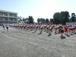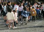 クラスごとに1列に並び、フラフープをリレーしていきます。寒い日が続きますが、休み時間等に校庭で元気よく遊び、体力の向上を図っていってほしいと願っています。