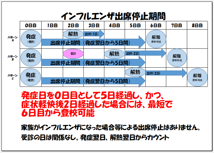 インフルエンザの場合は、解熱後2日間も出席停止期間となりますので出席停止5日目に解熱した場合は、出席停止期間が2日伸びて7日間となります。(下図参照)