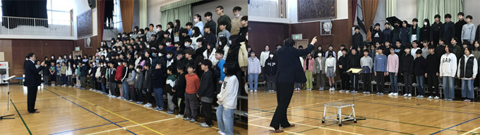 その後6年生の『COSMOS』のご講評もいただきました。「COSMOSとは秩序のある宇宙。地球は小さな石と鉄の粒が衝突して固まった星であり、その星の鉄分をほうれん草が蓄えて、それを私たちの体の中に栄養として摂取している。百億年も前から地球にある鉄分が今こうして私たちの体に流れている。地球が宇宙のように秩序のある世界ならば、一人残らず幸せになれるはず。」と歌詞の意味について伝えてくださり、それを真剣に来ていた6年生たちは「あぁ~~!!」と感動し、その後の歌声では歌詞の言葉一つ一つを大切に表現している歌声を体育館に響かせることができました。