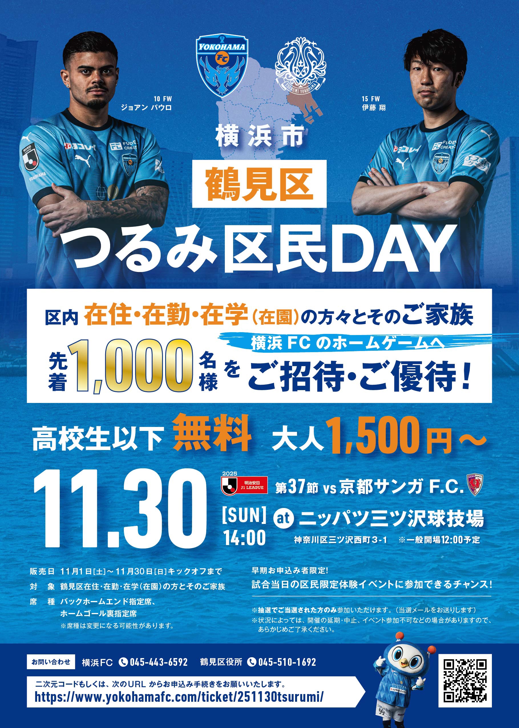 J1リーグ 横浜FC vs 京都サンガF.C. つるみ区民DAY 11月30日開催 ニッパツ三ッ沢サッカー場(令和7年11月2日)
