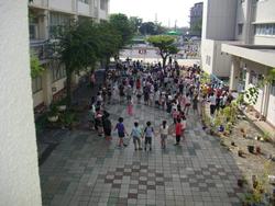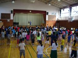 本校では、たてわり班(1年から6年生までの小グループ)に分かれて、交流活動をしています。夏休み明け最初の集会は、3つのグループに分かれて、「ボール運び」「フラフープ送り」「仲間集め」の活動を楽しみました。 |