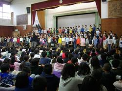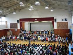 「はじめましてのともだち」では、サビの部分でリコーダーとタンバリンでアクセントをつけて音の重なりを表現しました。新しい友達との出会いの喜びが伝わるように、明るく楽しく歌いました。 「夕日が背中を押してくる」では、イメージを膨らませるために、歌詞から想像した情景をそれぞれが絵に描きました。そこから歌の練習をしたことで、歌詞やメロディーだけでなく、気持ちもしっかりそろえて歌うことができました。 |