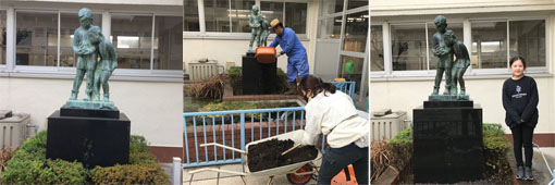 玄関すぐ隣にある池のほとりに「なかよし」の像があります。創立80周年記念に建立されたもののようですが、長い月日の間に植栽が伸びてしまい正面から文字が見えなくなっていました。そこに気づいたあさひっ子が本校の技術員に相談して再整備が実現しました。