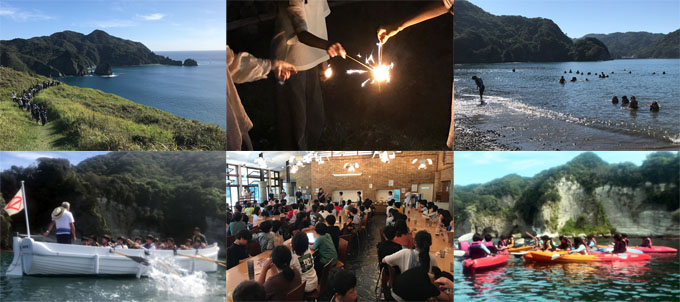 天然の崖と人工の防波堤に囲まれた静かな入海は多様な活動に最適で、ハイキングや遊泳、カヤックやカッターボート等の体験を貸切状態で行うことができました。