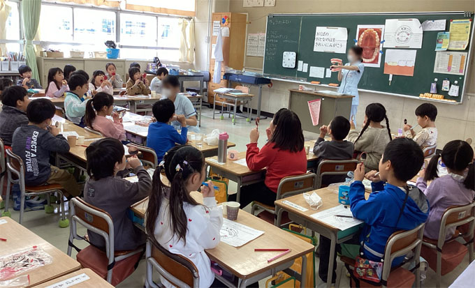 鶴見大学短期大学部・歯科衛生科の学生さんが10名、歯科保健教育実習のために訪れました。1年生の各教室で、紙芝居で第一大臼歯(前から6番目の歯)の大切さを伝え、模型を使って正しい歯みがきの仕方を指導してくださいました。実習生の話を静かに聞き、手鏡で真剣に自分の第一大臼歯をさがしている1年生の姿が素敵でした。生えたての永久歯をこれからもずっと大事にしていってほしいです。(矢﨑 倫子)