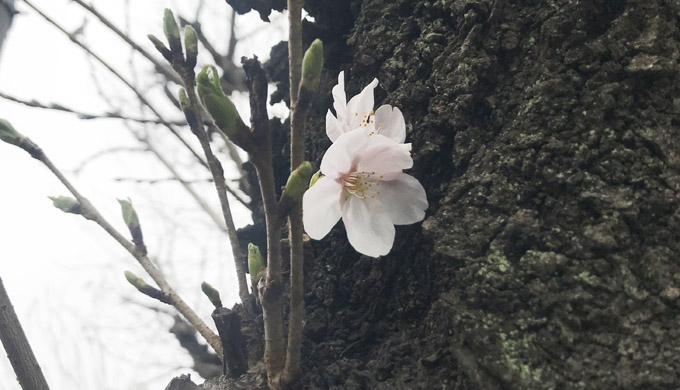 (写真は卒業式前日、校庭のソメイヨシノが一輪だけ花を咲かせた様子です)