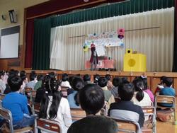 今年は、バーベットくんのマジックショーを楽しみました。空気砲や宙に浮く机、鉛筆を袋に刺してもこぼれない水などのマジックに歓声が上がりました。空中に留まる風船では、下に引っ張る重力と上に押す風の力の関係を2年生が説明してくれました。1年生も、「バーベット」の掛け声で次々と不思議なことが起こるのを笑顔で楽しみ、「また見たい」と話していました。