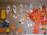 職員玄関をくぐると、正面にある大きな掲示版には、5・6組の子どもたちが作った季節感を感じさせる作品が貼り出されています。今は、ハロウィン♪かぼちゃやきのこ、そして上手に切り抜かれたがい骨が並んでいます。今年は何に仮装しましょうか?