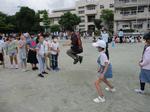 ソーシャルディスタンスに気を付けながら、8の字跳びで3分間跳びます。雨天が続き、なかなか練習が進みませんでしたが、各クラス、少しでも多く跳べるように努力しました。また、なかよし学年で応援し合い、励まし合っている姿も見られました。
