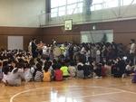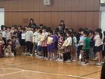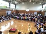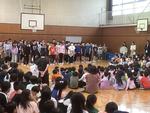 全校児童が体育館に集まって1年生を迎える会が、3年生によるアパツダンスで元気いっぱいに始まりました。