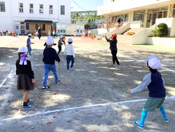 その後は、秋の歌を歌ったり、園庭で一緒に遊んだりしました。野毛山幼稚園には遊び場や楽しい遊具がたくさんあり、1年生と園児でなかよく遊びました。
