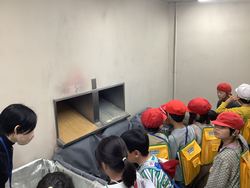 普段は見ることのできない地下の書庫にあるたくさんの本や資料、トレベーター(本を各階に自動で運ぶ設備)を見て、驚くだけでなく、説明に真剣に耳を傾けていました。