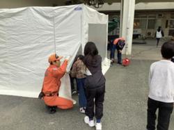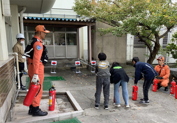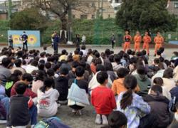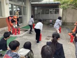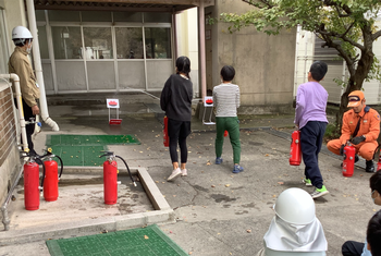 今月の避難訓練は横浜市消防局と磯子区役所総務課の方に来ていただき、火災避難訓練の様子を見ていただきました。その後、4年生は煙体験、5年生は消火器放水体験、6年生はハザードマップを基に防災教室を実施しました。