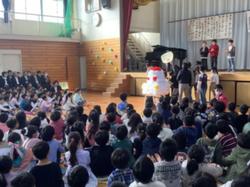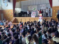 今年は、本校創立70年の記念の年です。15日(土)、70周年記念式典を行いました。児童が主体となって会を計画・運営し、手作りケーキにろうそくを立て70年のお祝いをしたり、マスコットキャラクターの美貝(ミシェル)とじゃんけんをしたり、70周年に関するクイズを行ったりしました。