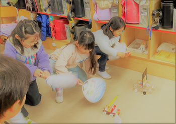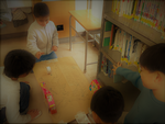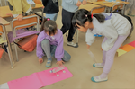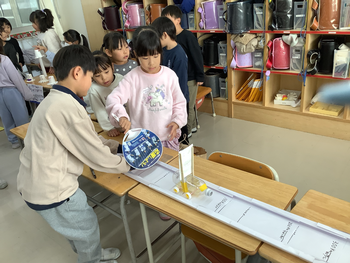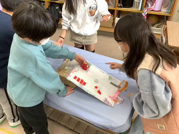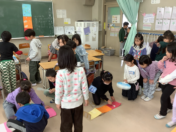 2年生の生活科「あそんで ためして くふうして」で作ったおもちゃで、遊ばせてもらいました。紙コップのロケットや、うちわで仰いで動くペットボトルの車など、工夫がたくさんありました。子どもたちは、初めて見るおもちゃに、驚き、とても楽しそうに遊んでいました。「2年生になるのが楽しみ。」と振り返る子もいました。