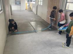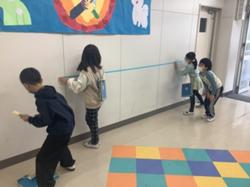 2年生が長い長さのテープをもって、校内をまわっていました。聞いてみると、3mの長さを探しているそうで、いろいろな長さを測っていました。スカイブリッジの幅は、3mには満たない長さでした。このような活動を通して、量の感覚を培っています。