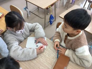 1年生の算数「広さくらべ」では、じゃんけんをして自分の陣地を広げ、比べていました。実は、4年生でも、同様の学習が展開されていました。4年生は、広さを数値化しようとしている学習でしたが、1年生での学習のつながりが非常に強いです。下学年で経験したことを上学年で学びを深めている一場面でした。