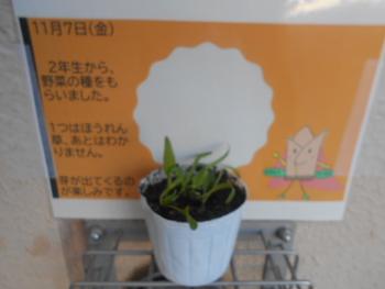2年生が育てている野菜がだいぶ大きくなってきました。登下校の際に毎日本当によく気にかけています。もうすぐ冬休みに入りますが、これからの生長が楽しみです。種をまいている時に分けてもらった種も芽を出し、大きくなってきました。