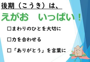 朝会では、節目を生かして取り組むことと後期にがんばりたいことの話がありました。前向きな気持ちになれるよいタイミングです。声をかけながら進めていきたいと考えています。