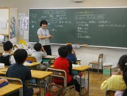 ▲3年2組は、習字です。今日は、筆の使い方を確認して、「一」を書きます。▲3年4組は、音楽です。「茶つみ」の曲を歌いながら、曲に合わせて手遊びをしています。▲