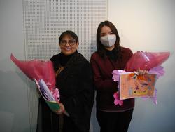 ▲朝のテレビ集会は、国際理解教室(パキスタン)のアティア先生と外国語活動のアンドレア先生への感謝の会が行われました。代表児童から、各クラスからの寄せ書きを花束が渡されました。▲左:アティア先生、右アンドレア先生▲