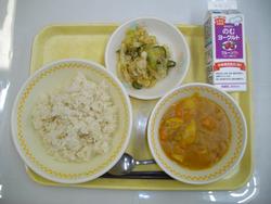 ▲今日の給食は「胚芽ごはん、チキンカレー、ごま酢和え、プルーン発酵乳」でした。今日のチキンカレーは、トマトをたっぷり使っていて、チキンとトマトのうまみが感じられるカレーでした。▲算数少人数教室の前には、以前出題されていた「実のなる木のクイズ」の解答と説明が掲示されています。▲