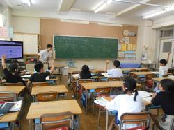 ▲5年2組は、理科です。雨が降った時の川の流れの変化について、映像を見ながら学習しています。▲6年1組は、理科です。食物連鎖に対する自分の考えを黒板に記入しています。▲