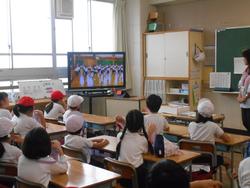 ▲2年1組は、運動会の演技練習のビデオを見ながら、自分の動き方を確認しています。▲2年4組は、ビデオの演技を見ながら、教室で練習です。▲