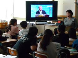 ▲3年1組は、国語です。これから、グループに分かれて、自分の文章を発表し合うようです。▲4年3組は、社会です。地球温暖化についての映像を見ていました。▲