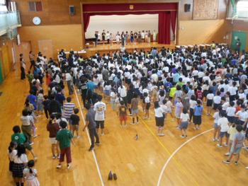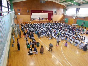 今日は体育館で全校集会がありました。どうしたらみんなで楽しめる集会になるか、いつも集会委員会の子どもたちが考えて準備をしています。集会が始まると明るい雰囲気で会を進めていました。こういう取り組みの積み重ねで子どもたちの異学年の交流も自然になってきています。