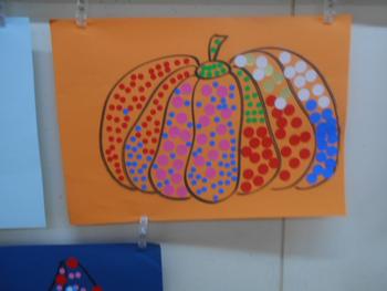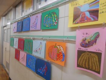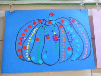 草間彌生さんの作品をイメージしてのドットアートです。みんな思い思いに表現をしてあります。活動の様子が目に浮かぶようです。