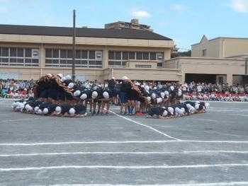 5年生の演技は「GO!絆パフォーマンス」。動きをそろえるということ、行進一つをとっても簡単なようで大変ですし、しっかりできるようになるとみている人に気持ちが伝わってきます。ひとつひとつの動きは簡単なようで自分の体を支える動きは簡単ではありません。たくさん練習してきたことが伝わってくる演技でした。見ている人たちから「おぉっ」という歓声が上がっていました。