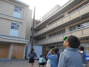 その横で、3年生の子どもたちは理科の学習で太陽の観察をしていました。遮光版を使って太陽を観察できることに驚きながら、しっかり観察をしていました。